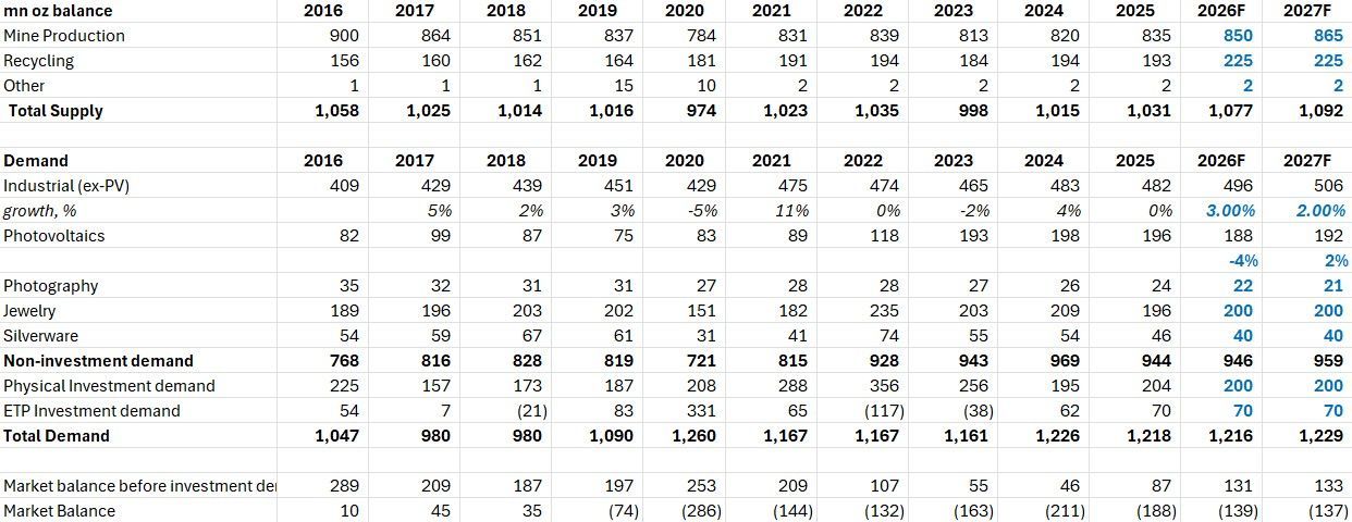 Despite the more than three-fold increase in the silver price since January 2024, the supply and demand deficit for the metal hasn’t improved much. Beginning with supply, we expect a de minimis year over year increase in mine supply in 2026 and a 30-million-ounce uptick in recycling. Taken together, we forecast total silver supply will increase 4% in 2026. It’s worth noting that an uptick in recycling is likely a one-time phenomenon, and going forward silver supply growth will depend solely on mine supply. On this point, despite the high silver price, we expect very little mine supply growth again in 2027. Sustained increases in silver mine supply require a more permissive permitting regime in countries such as Mexico, Guatemala, Peru and Chile.